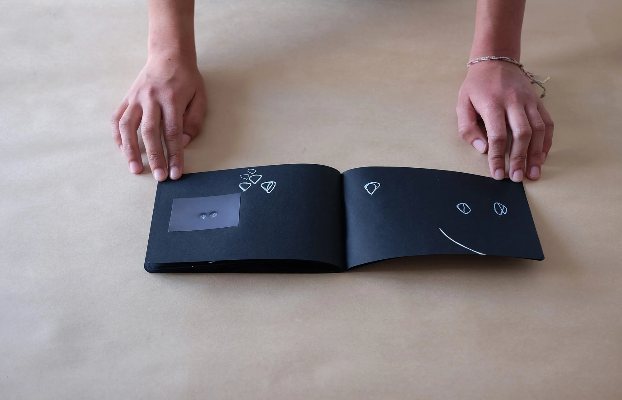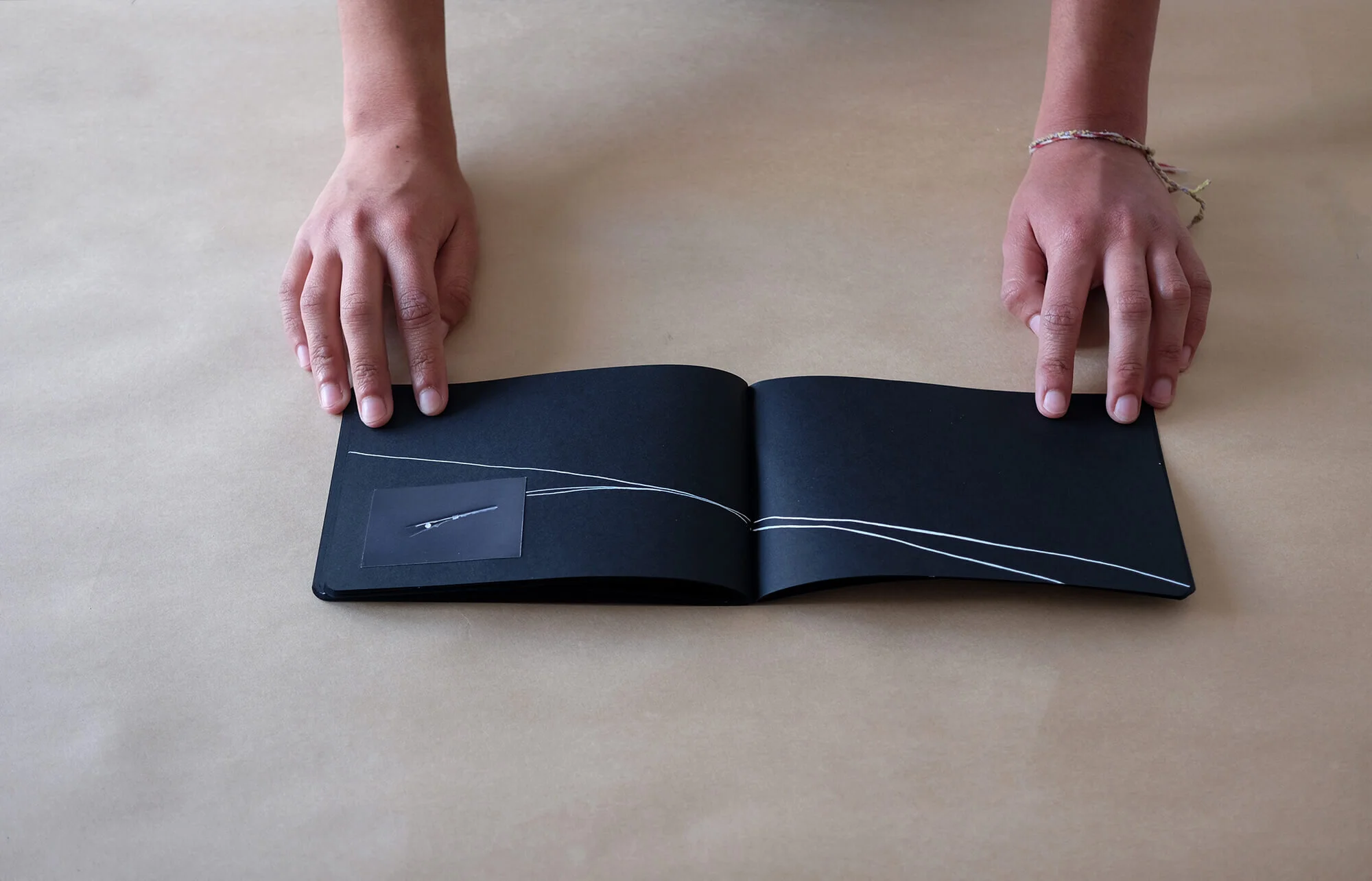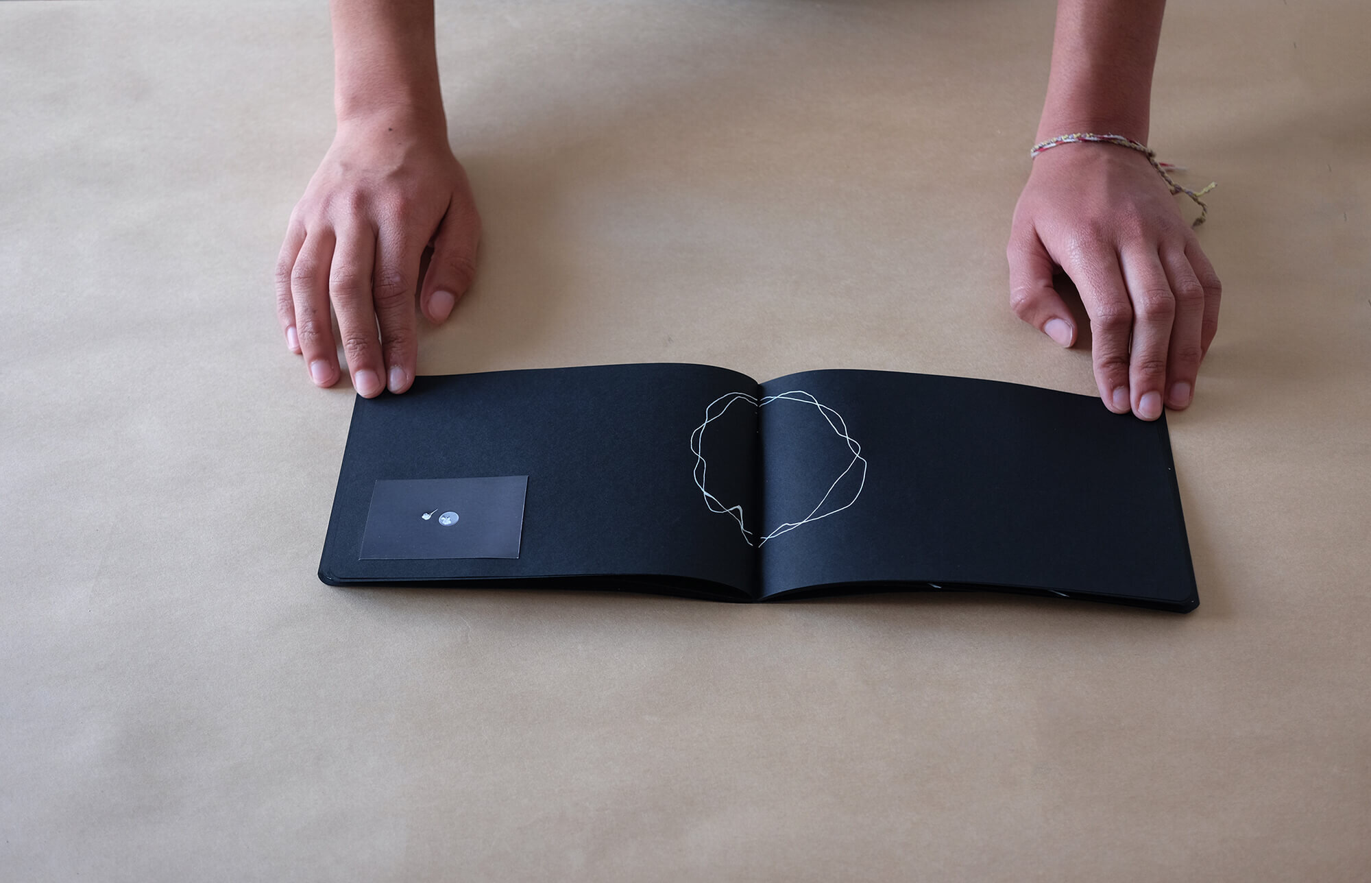 A collection of 3 hand made photo books with black and white prints and gold acrylic drawing
